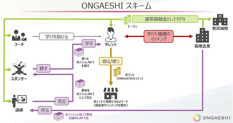 まず、教育を受けさせたい人=スポンサーが受講権を購入。スポンサーはこの権利を、教育を受けたい人=タレントに貸し出す。そこで育ったタレントが、ONGAESHI内の企業に採用されると、その企業が一定の費用を支払う。その費用の一部は、人材育成へ貢献したリターンのように、スポンサーや講座の講師にまわる。