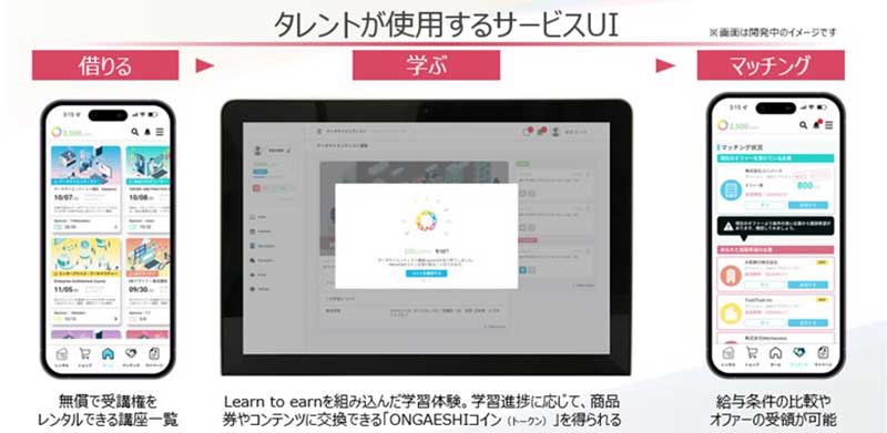 ONGAESHIのサービスイメージ。タレントはスマートフォンやタブレットでポジションNFTのレンタル、リスキリング、企業のマッチングを行う ※画面のデザインは制作中のもの