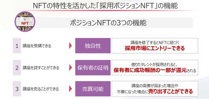 スポンサーは購入したポジションNFT(受講権)をタレントに貸し出し。ポジションNFTには過去の所有状況などが記録され、タレントが企業に採用された場合、所有者には連帯貢献金が付与される。こうして「エコシステム」が成立する