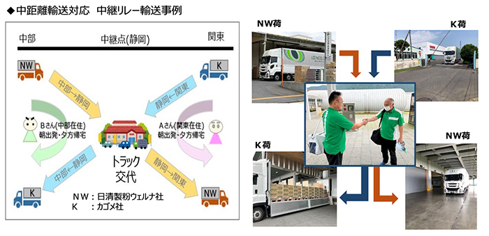 関東から中部、また中部から関東へ物を運ぶ場合、1人のドライバーが拠点間を往復するには、どうしても1泊2日かかってしまい、帰り荷も確保できない場合があるといった問題があった。そこで、関東から中部へ向かうトラックと、中部から関東へ向かうトラックのドライバーが中継地点の静岡県で落ち合い、トラックを交換することにより、日帰り運行を可能にしながら、常にほぼ100%に近い積載率を維持できるようになったという。