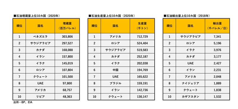 2020年の世界各国の石油輸出量・生産量・輸出量。上位10カ国のうち、中東地域はサウジアラビア、イラク、UAE、イラン、クウェートの5カ国。天然ガスもカタールが3位に入り、埋蔵量の上位10カ国では4カ国が入っている