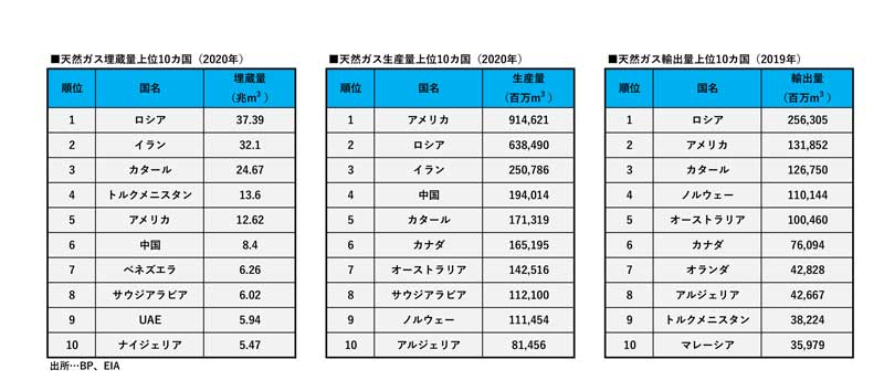 2020年の世界各国の天然ガス埋蔵量・生産量・輸出量。石油輸出量では2位だったロシアは天然ガス埋蔵量・輸出量で1位。生産量1位のアメリカに対し2倍近い輸出量だ