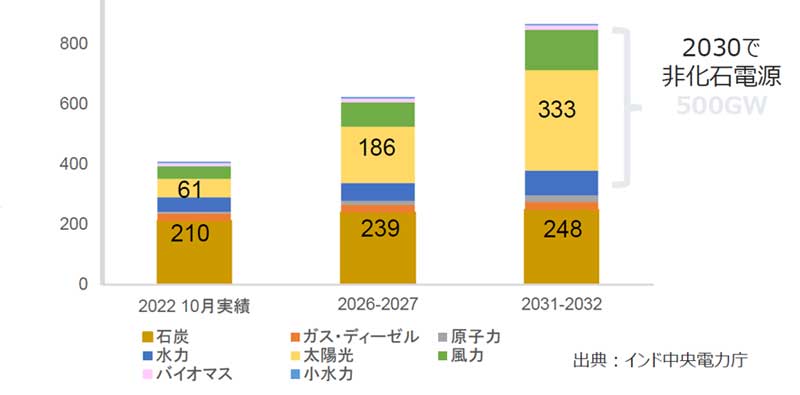 インド中央電力庁による、インド国内の電源構成推移計画(容量ベース)。縦軸はGW(ギガワット)