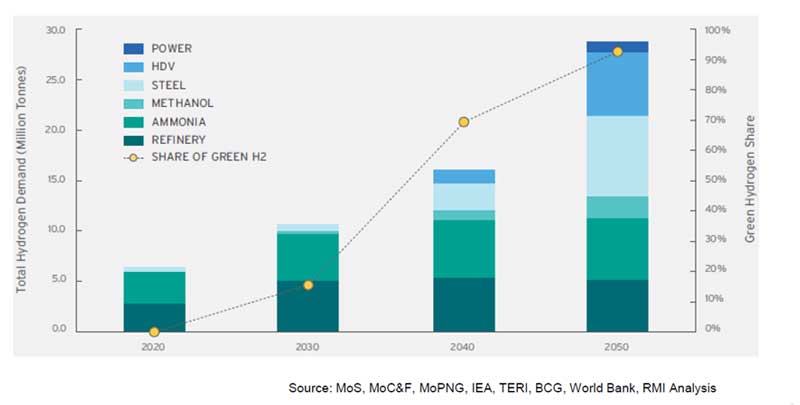 インドの水素需要予測。2030年の段階で1億tの需要が見込まれ、うち5%程度がグリーン水素によって賄われると試算。今後インドでは鉄、肥料、石油精製、いずれの産業も増産、発電用資源ではなく産業用資源は底堅く増えることが見込まれる