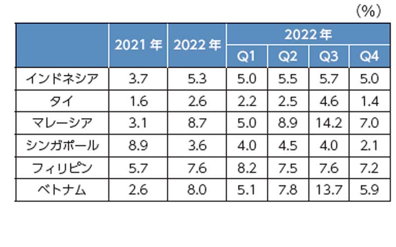 2022年の実質GDP成長率。インドネシア5.3%、タイ2.6%、マレーシア8.7%、シンガポール3.6%、フィリピン7.6%、ベトナム8.0%と各国でプラス算出となっている