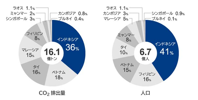 ASEANにおけるエネルギー起源CO2排出量と人口構成。共に3分の1以上をインドネシアが占めている