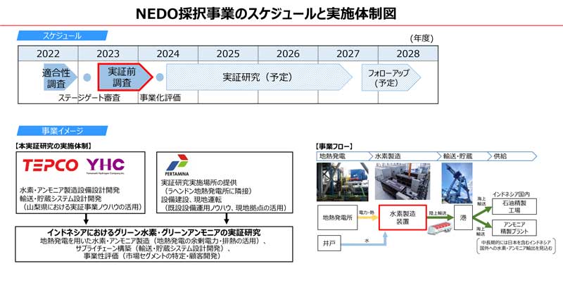 NEDO事業「地熱発電の余剰電力・排熱を活用した低廉かつ事業性のある水素製造・運搬を実現するための水素技術等実証研究」のスケジュールと実施体制