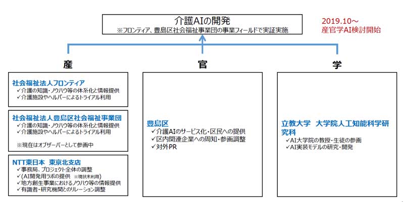 介護福祉関連のAI活用を進める上での、プロジェクトにおける産(フロンティア、豊島区社会福祉事業団、NTT東日本)、官(豊島区)、学(立教大)それぞれの役割