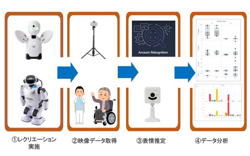実証では、それまでの介護士による童謡や早口言葉などのレクリエーションとは別に、自律走行型ロボット「temi(テミ)」と会話や歌を楽しむレクリエーションや、VR(ゴーグル装着型)のレクリエーションを新たに実施。レクリエーション後に利用者一人一人に行ったインタビュー映像の様子を記録した映像・音声データを、AIアプリ「Amazon Rekognition」 を用いて感情・発話推定を行い、どんなプログラムが効果的だったかを検証した。介護ロボットのより効果的な用い方を、AIで検証した構図だ。