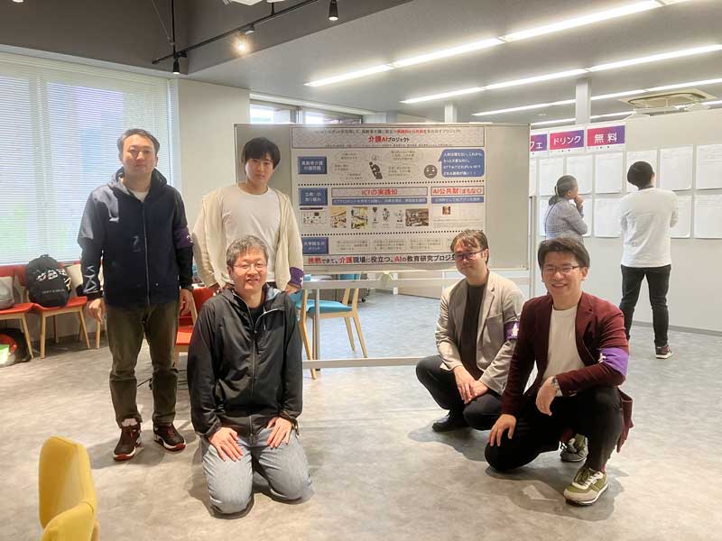 大庭教授(右から2人目)とプロジェクト参加メンバー。「立教大は、AIのバックグラウンドを持つ学生が毎週、介護現場を訪問しドメイン知識を学びつつ、何が必要か手探りで構築していく取り組みを年度単位で行っています」(大庭氏)
