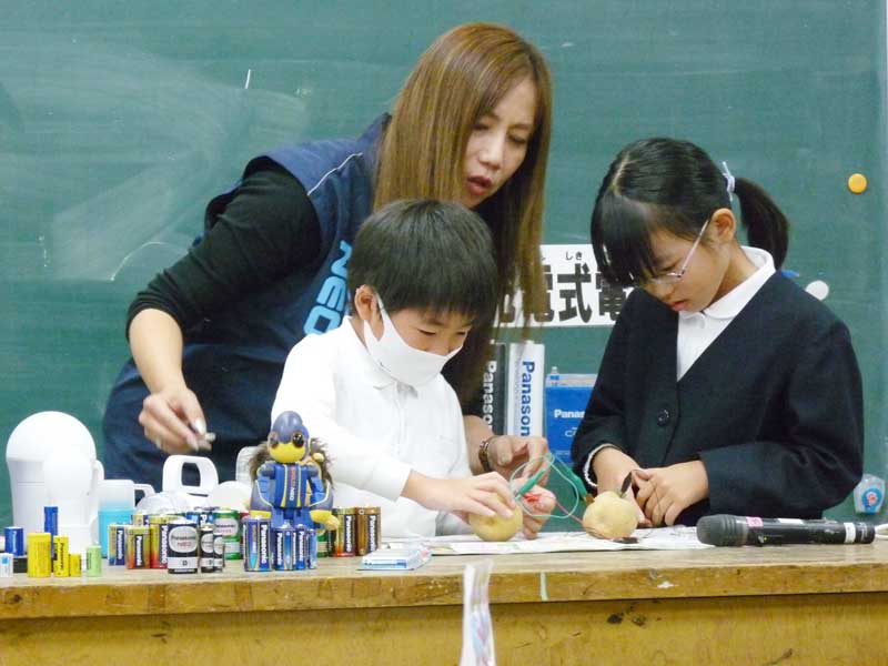 出張電池教室での「ジャガイモ電池」実験の様子。野菜電池の一種で、ジャガイモに含まれるリン酸と亜鉛が反応することで電流が発生する