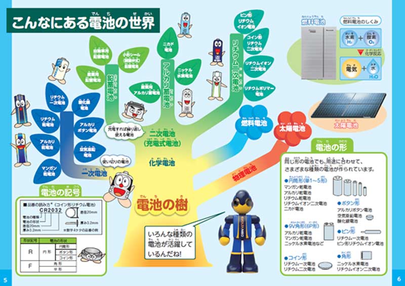 授業で使用される副教材「電池ものしりBOOK」より。電池の種類の章ではリチウムイオン二次電池など最先端のエネルギーデバイスについても細かく分類・記載されている