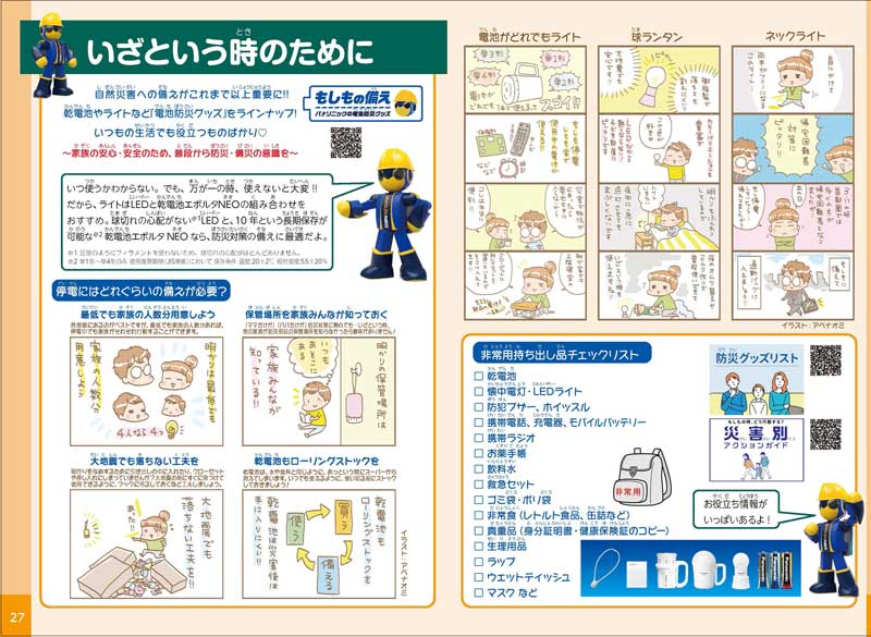 「電池ものしりBOOK」より。「いざという時のために」と題したもしもの備えとして、停電、災害時の電池、電気の取り扱いの解説が小学校における防災教育にも役立てられ、ひいては電気、エネルギーの大切さを学ぶ機会を拡張した