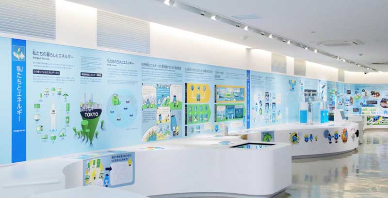 「東京スイソミル」展示スペース。エネルギー問題の現状から「なぜ水素が必要なのか」を知り、水素をつくる・ためる・はこぶ・つかうサプライチェーンの仕組み、水素の活用例などが分かる