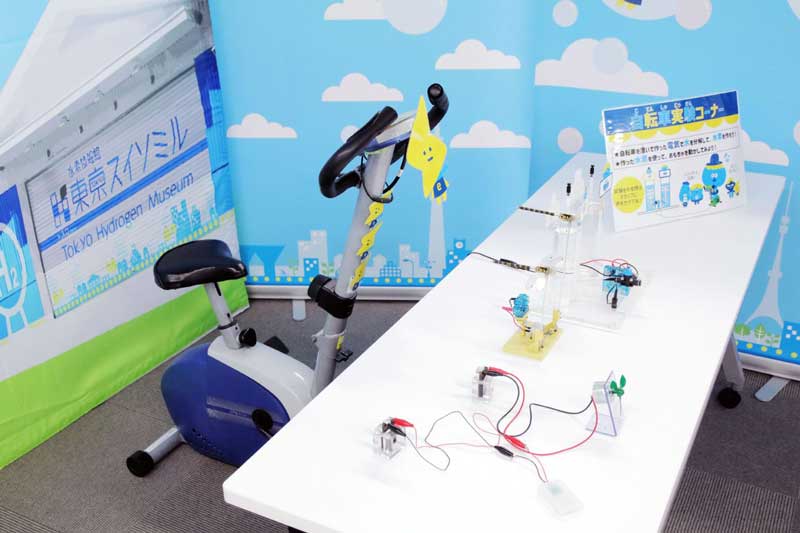 「東京スイソミル」の体験コーナー。自転車をこぎ、体を動かすアクティブな体験と、水電解と発電による水素の見える化など、工夫の詰まった水素のサプライチェーンの実験展示だ
