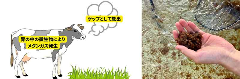牛の胃の微生物により消化分解と同時にメタンが生成され、ゲップとして排出される。メタンはCO2の約28倍の温室効果があり、気候変動の対策の一環として課題となっていた。「カギケノリ」(画像右)を飼料に0.2%混ぜて牛に与えると、メタンガス排出量が最大98%減少するという