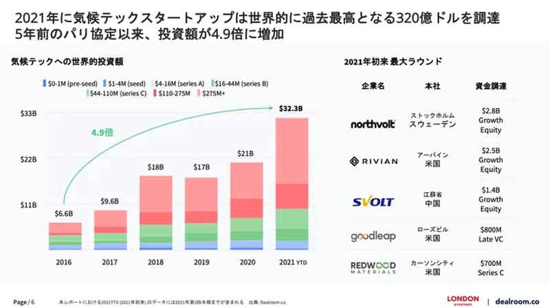 2021年、気候テックのスタートアップは世界で過去最高の320億ドルの投資を調達。5年間で投資額がおよそ5倍に増大した