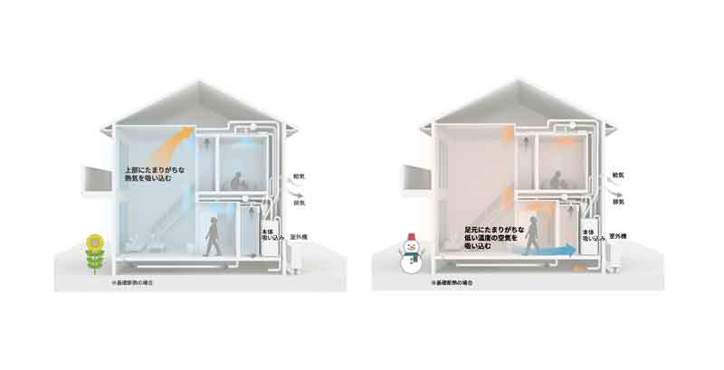 LIXILの全館換気空調システム「エコエアFine」の特徴の一つ「自動循環切替システム」。夏は空間上部の熱気を取り込み空調し、冷房の涼しい空気を全体に行き渡らせる(画像左)。逆に冬は足元の冷気を取り込み空調し、暖房の暖かい空気を足元まで行き渡らせる(画像右)
