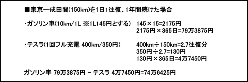 望月さんは以下のようなコスト計算をして、テスラとガソリン車の違いを説明してくれた。