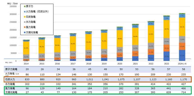 中国の発電設備容量内訳の変遷。同国は2020年に「3060目標」表明後、分野ごとの低炭素化計画を策定。風力・太陽光発電設備を急速に増やし、再エネ、EV(電気自動車)、電池の分野で海外市場含め著しく成長を遂げている