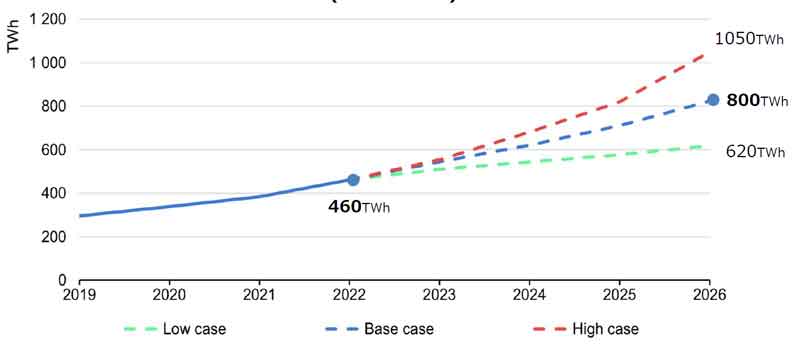 IEA(国際エネルギー機関)は2024年1月、世界のデータセンター、 AI などの電力需要は 2022年の460TWhから2026年ベースケースで800TWhまで増加する見通しを発表している