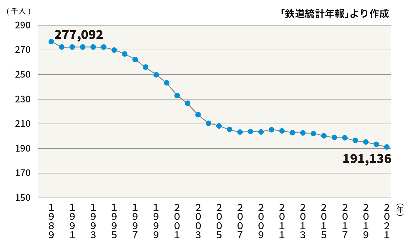 国土交通省が全国の鉄道、軌道、索道事業者の統計について編集した「鉄道統計年報」によると、全国の鉄道事業者の職員数は、1989(昭和64・平成元)年の27万7,092人から減少し続け、2021年時点で19万1,136人と報告されている。
