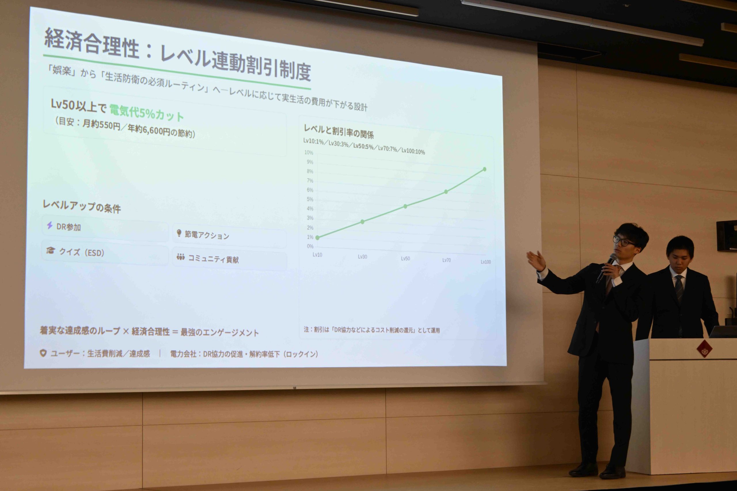 トップバッターは東京理科大学のチーム「桜!」の2人。“面倒な節電を、楽しいエネルギーマネジメントへ”をキャッチフレーズとした、エネルギー最適化ゲーム『タイモン』を提案した。