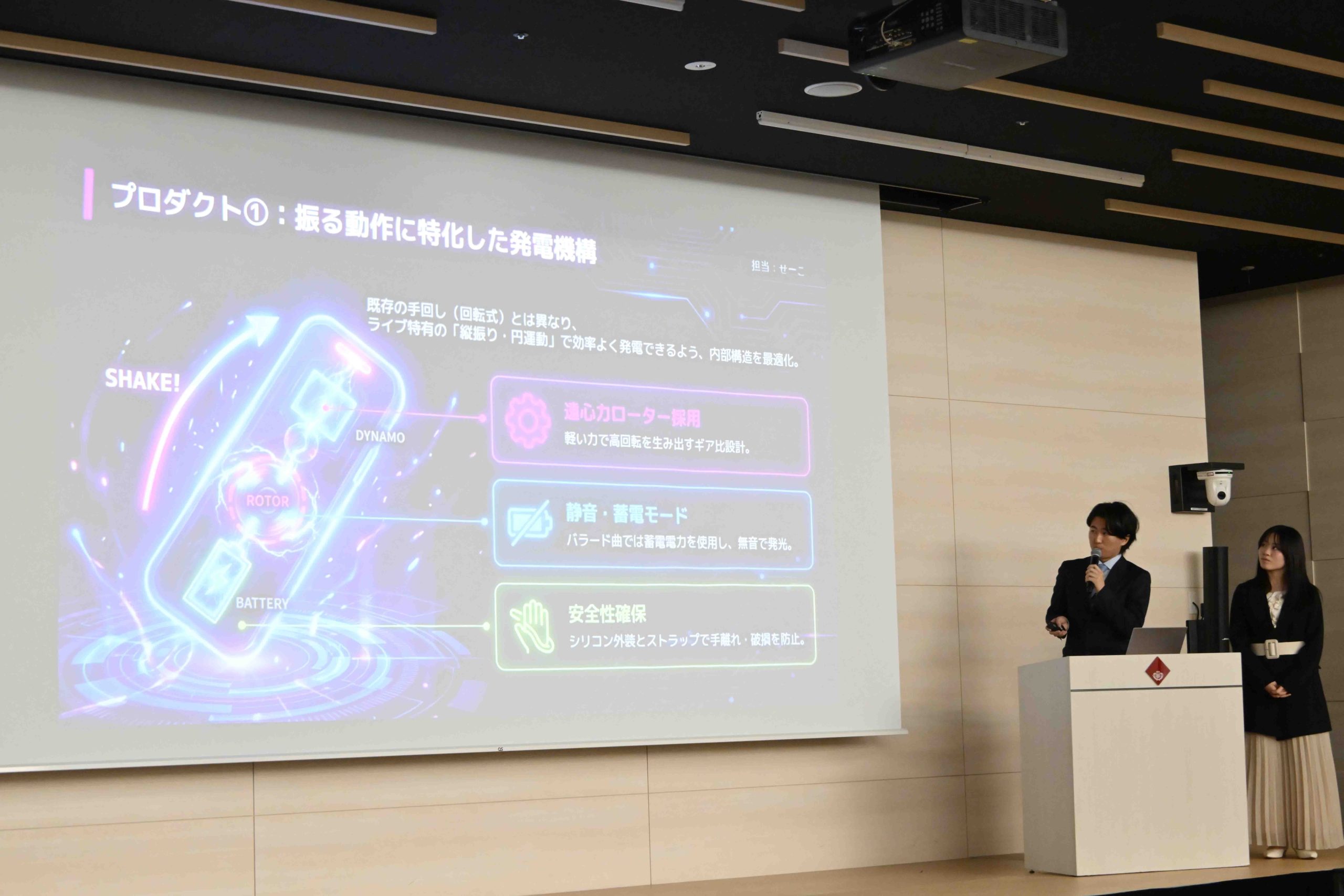 早稲田大学のチーム「愛は世界を救う」は、これまでのゲーム主体のアイデアとは異なり、発電システム内蔵の『推しの光を創る 振り回し発電式サイリウム』を提案。