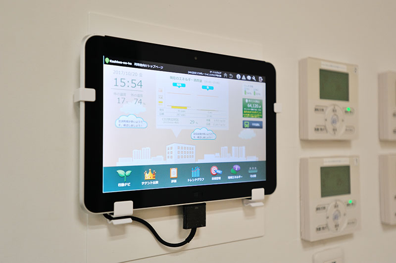 柏の葉スマートシティ「KOIL」ビルの日立オフィス入り口には、第1回で紹介したHEMSのオフィス版“見える化”端末が設置されていた