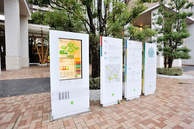 街全体のエネルギー消費量といった情報をリアルタイムに表示するデジタルサイネージが各所に設置されている