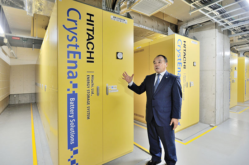 ゲートスクエアに設置されたエネルギー棟には、産業用としては国内最大級となるリチウムイオン蓄電池(3.8MWh)を設置(写真)。ららぽーとには、より大容量に蓄電することができる日本ガイシ製のNaS蓄電池(12.96MWh)を設置している