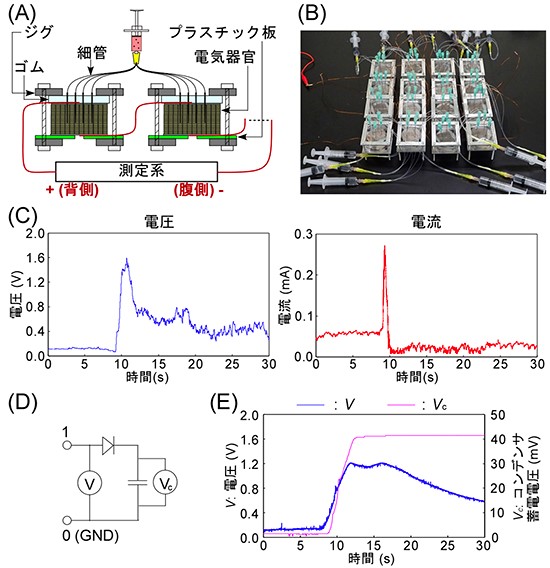 電気器官直列発電ユニットを用いた発電デバイスと電圧・電流の測定結果(出典:理化学研究所)(A) 直列デバイスの原理図 (B) 実際のデバイス写真(16直列型) (C) 電圧と電流の測定結果。ピーク電圧1.5 V、ピーク電流0.25 mAを達成 (D) 蓄電回路図 (E) 発電電圧(V、青)とコンデンサ蓄電電圧(Vc、ピンク)。発電後、コンデンサの電圧が上昇し、それが一定(約40 mV)に保たれたことから,電力を電池のように一定供給できる可能性を示した