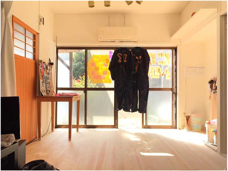 「結」という字を2分割して「糸と吉~ゆい~」と名付けられたリノベーション中のハウス。外装はまだまだだが、内装は床に釜石産の杉でフローリングが張られきれいに仕上げられている