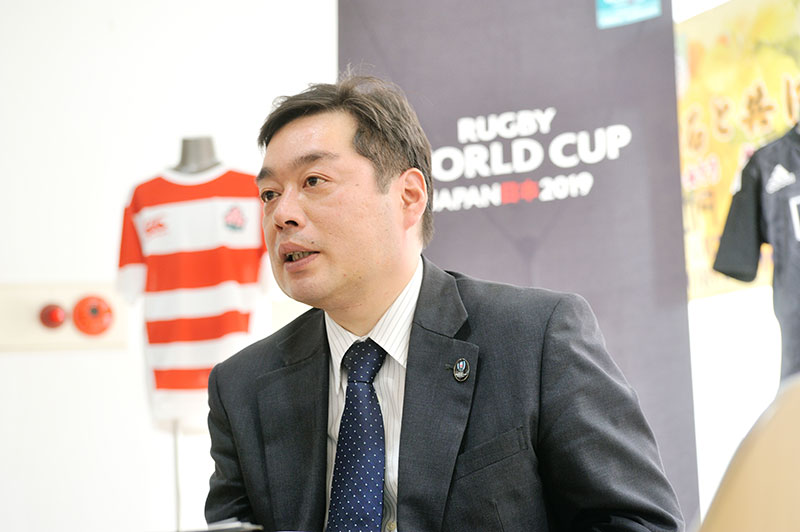そんな中で、ラグビーワールドカップ2019TM(以下、RWC)の日本開催が決まっても当初は開催地に名乗りを上げようという空気はなかったのだと、最初に訪ねたRWC2019推進室 山本洋樹室長は教えてくれた。