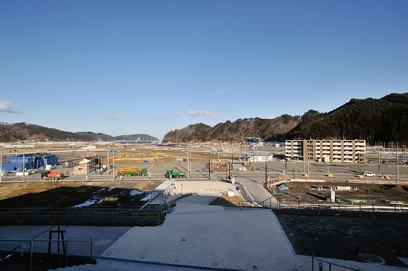 高台から大槌湾を望む。中央にわずかながら、山本室長が紹介してくれた建設中の水門が見える。その右手にスタジアムのスタンドが建てられている。周辺のアクセス道や鉄道も2019年の開催に向けて急ピッチで建設が進められている