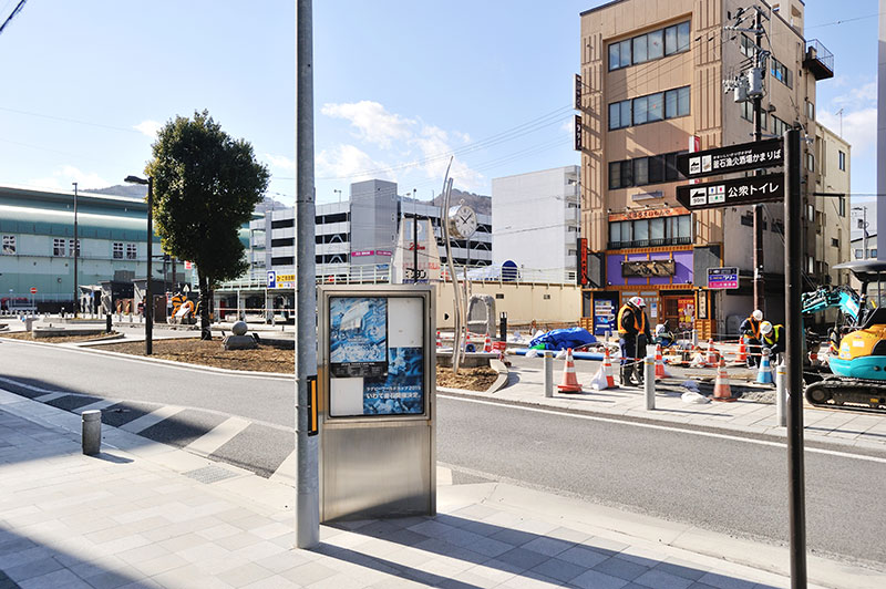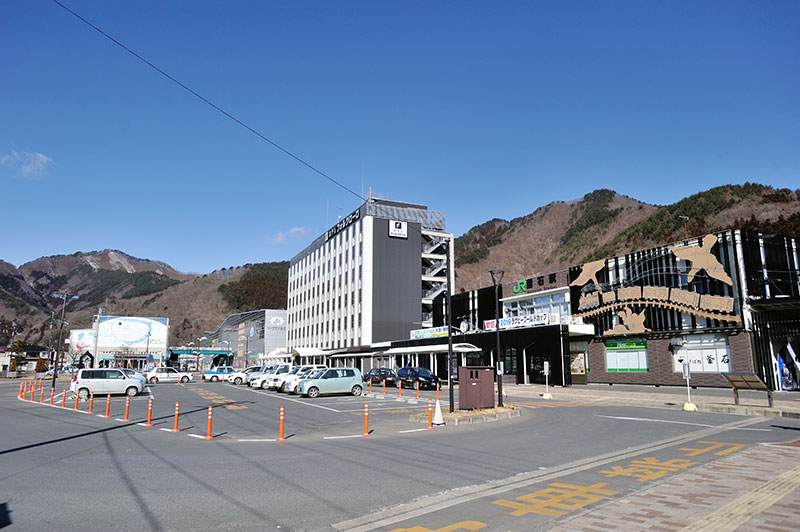 釜石駅に隣接して、2015年オープンの真新しいホテルと、その奥にRWC2019推進室の入る「シープラザ釜石」が立つ