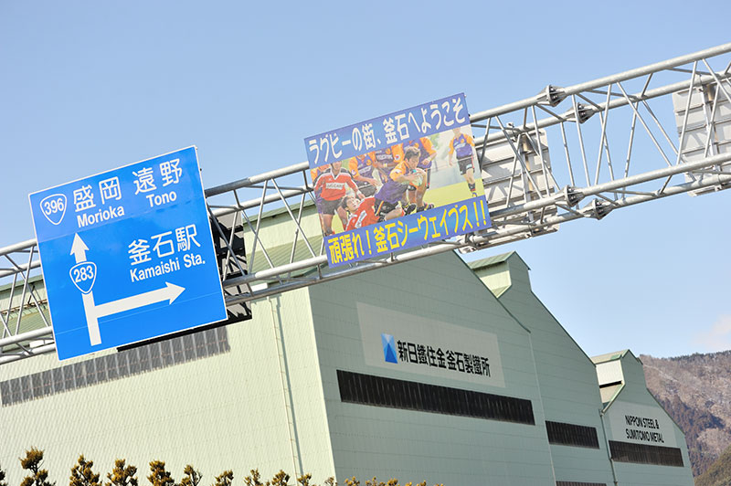 駅前を通る国道283号にはラグビーの街の看板がかかる。国道を挟んで立つのが新日鐵住金 釜石製鐵所