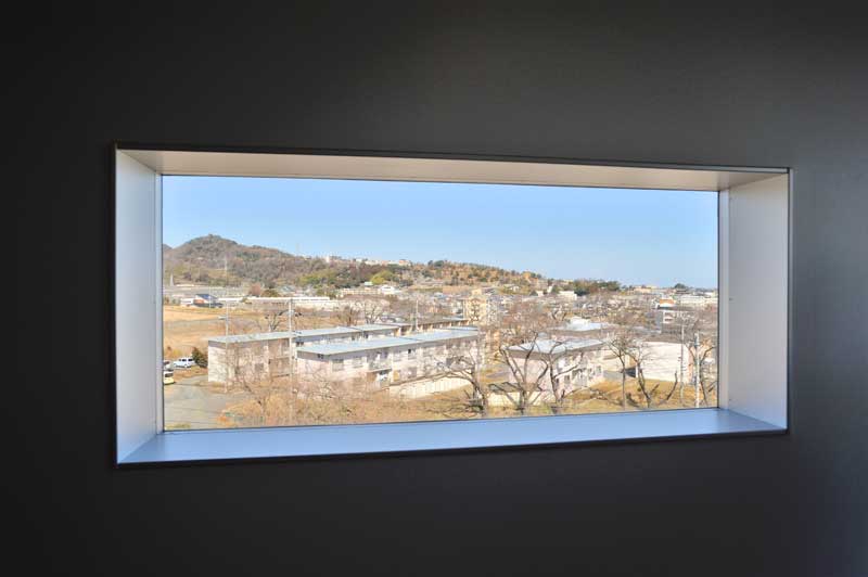 真っすぐに約80m延びる廊下。窓も広めにとられていて、市内や山並みが一望できる。下の写真のような、景色を写真のように切り取る小窓もあったりと、来庁者をおもてなししようという設計思想が感じられる