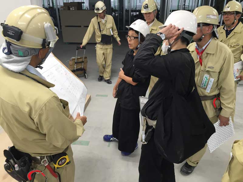 新庁舎の建設現場を訪れた妹島和世さん(写真中央の女性)。工事の各段階ごとに現場を訪ね、細かくアドバイスをもらったという
