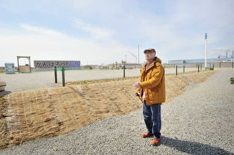 奥田弘幸さんは1963(昭和38)年生まれ、神戸市出身。最初に取材先の道中に立ち寄った南浜・門脇地区は災害危険区域に指定。「石巻南浜津波復興祈念公園」として整備される予定で、現在、慰霊碑や東日本大震災メモリアル「南浜つなぐ館」(写真下)が立つ