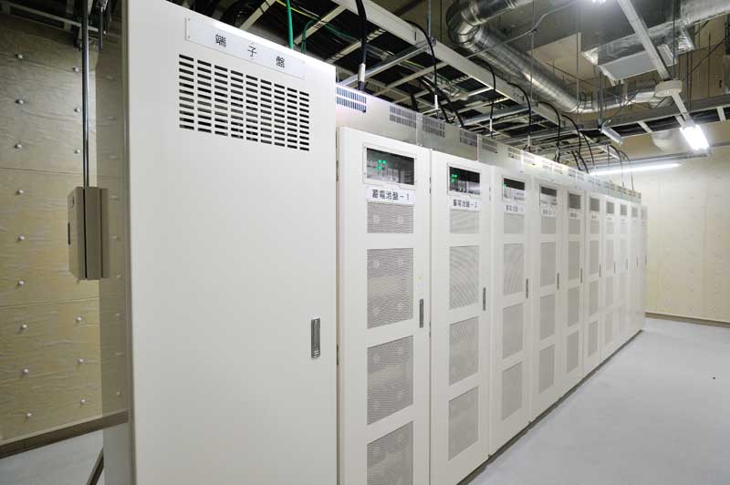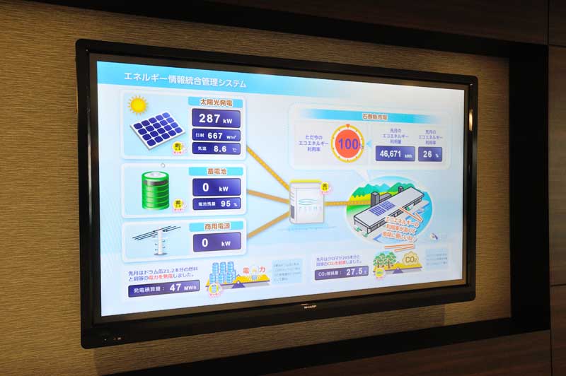 リチウムイオンの蓄電池を導入。太陽光発電と共に省エネ、二酸化炭素の削減などに寄与する。事務所棟にコントロールシステムEMSがあり、使用状況をモニタすることができるほか、市場エントランスのTVモニターにも情報を表示する(写真下)