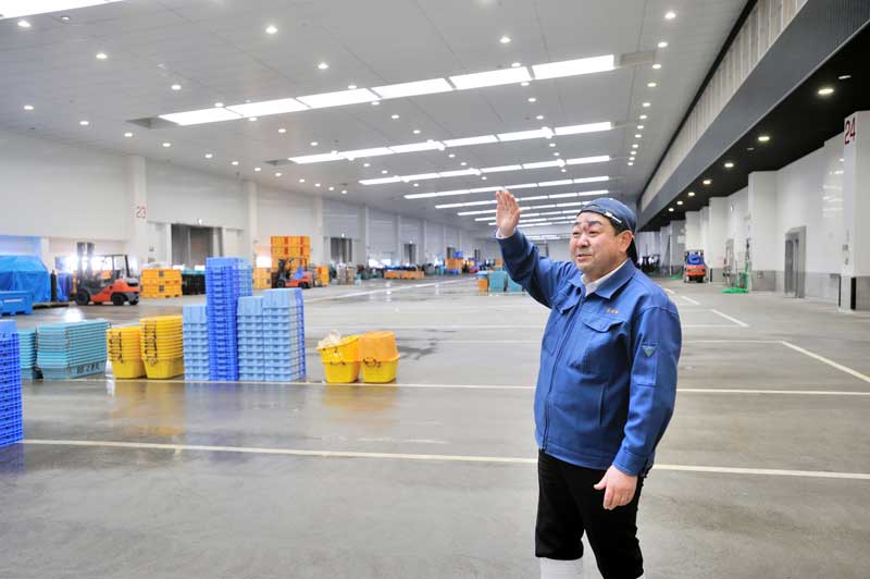石巻市水産物地方卸売市場管理事務所の副所長 齋藤俊和さんは、1973(昭和48)年生まれ、石巻出身。写真のとおり荷捌きエリアは封鎖型となっている。「開放型だった以前の建物は寒くて、ドラム缶を置いてたき火をしていましたが、今はそんなに冷え込むこともありません」