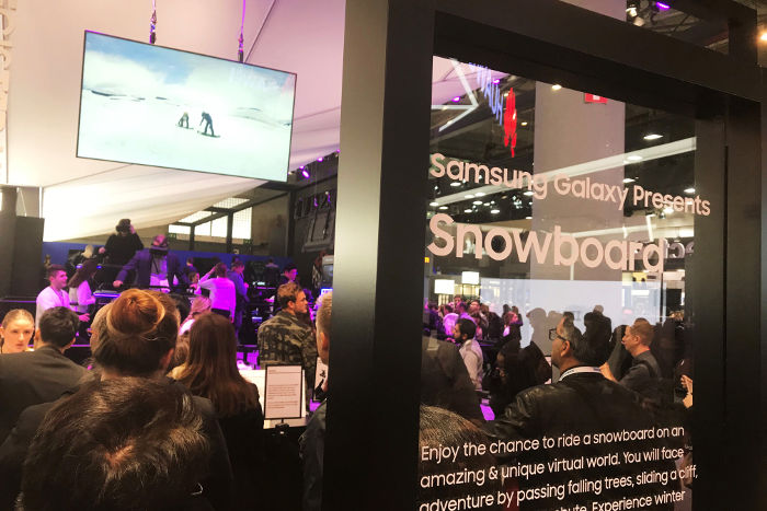 韓国・サムスンが展示した、スノーボードのVRブース。サムスンは、最新スマートフォン、VRコンテンツの他にもスマートホーム、IoT端末関連の製品を展示した