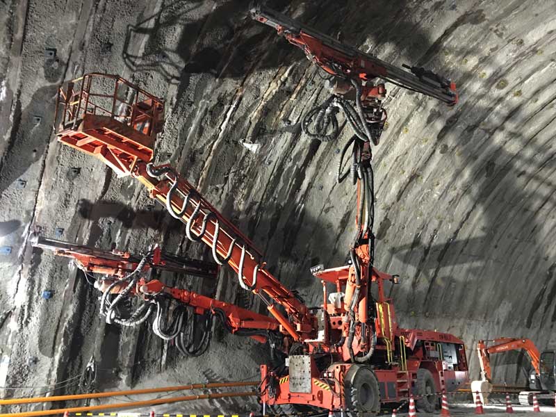 「これは発破のための削孔・装薬とロックボルト(岩盤内の削孔に差し込んで使用するボルト)の打設に使用する機械で、トンネル工事では一般的に導入される重機です。今回はフィンランド製のものにこだわりました。この現場で使用することを考えると、日本製のものに比べ、あらゆる面でエネルギー効率が良いのです。ヨーロッパは硬い地盤の山が多いという特性があるのですが、掘るスピードとパワーがこの現場なら優位と判断しました。また、日本製のものよりブームの届く範囲が広いのも大きなメリットです。今回のような広大な穴の中での作業ですと、日本製のものは重機自体の移動が必須になります。それだけでエネルギーロスが発生してしまいます。フィンランド製だと、高い場所にもアームが簡単に届いてくれる。かなり作業の効率化につながったと思います」