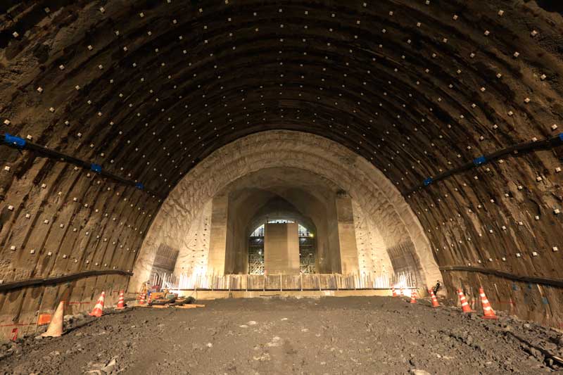 「工事にはたくさんの工程があります。一気に大きな穴を掘ることはできないので、最初は小さい穴から掘っていきます。工事の方法としては1950年代にオーストリアで考案された『NATM(ナトム)』を採用しています。ヨーロッパで生まれたということで、もともとは硬い岩盤に適したものでしたが、今ではさまざまな地質に適合し、トンネル工事の主流となっています。簡単に言うと、吹き付けコンクリート(すぐに固まる特殊なコンクリート)とロックボルトで、地山が掘られたところを支えるという工法です」