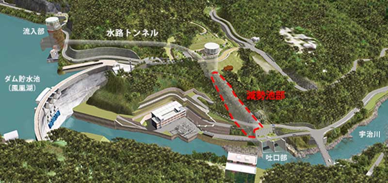 ダム貯水池から水路トンネル、今回工事を行っている減勢池部を通り宇治川へ。貯水量の効率的な調整が可能となる