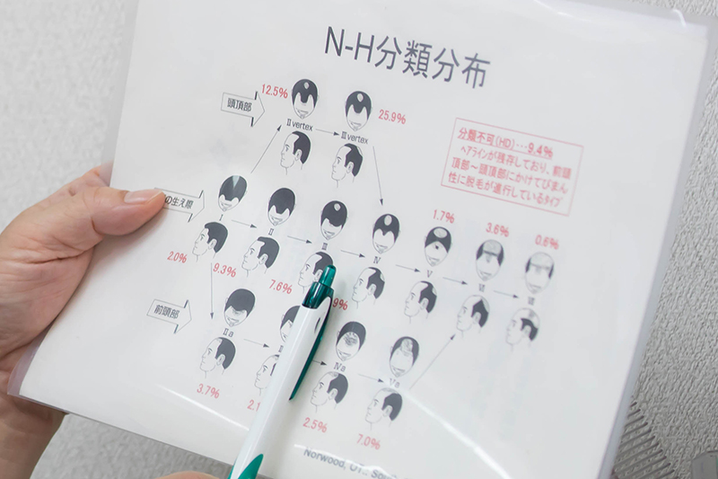 「25歳くらいの人が最初に訪れる段階では、なんとなく薄いかなというレベル。次の段階といわれる状態…M字形が奥に深くなり始めたり、頭頂部が薄くなったりするのが30歳。さらに先に進むのは35歳くらいというのがデータベースから見て取れることです。つまり、5歳ごとに1段階ずつ進行していくんですよ。だからこのデータベースを見れば、初診時の年齢と進行具合から、その後、自分の薄毛がどのように進行していくかが分かるわけです」