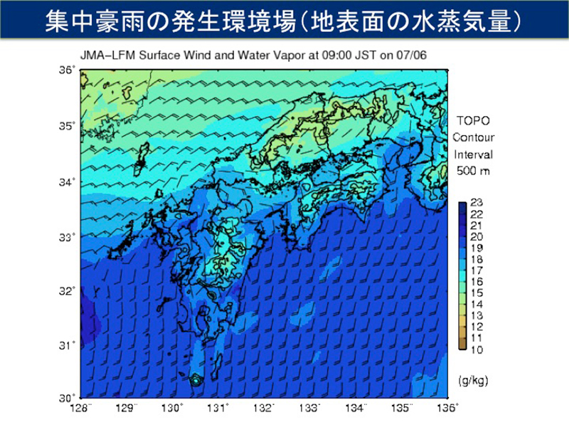 「7月6日の水蒸気の量と風の分布を見ると、梅雨前線に向かって南風によって運ばれた水蒸気が継続して吹き込んでいます。この状況が長く続いたことが、大気にとって重要な出来事でした」