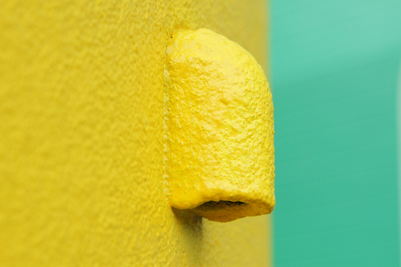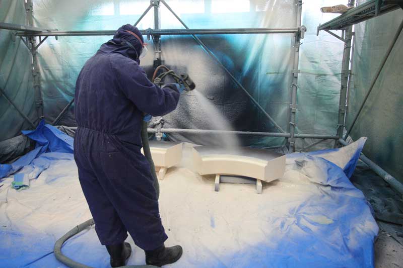 金型からパーツごとに作成した難燃性発泡スチロールに、コーティング剤のポリウレアを吹き付ける