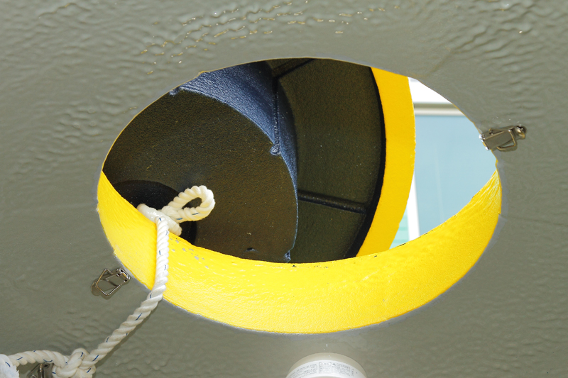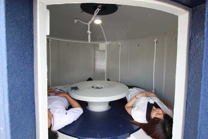 「天井に穴を開けたのは、ひっくり返ったときに脱出するためです。そして室内の要所要所に数cm幅の穴を開け、万一浸水した場合、外に排水できるようにしました。